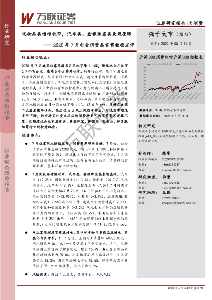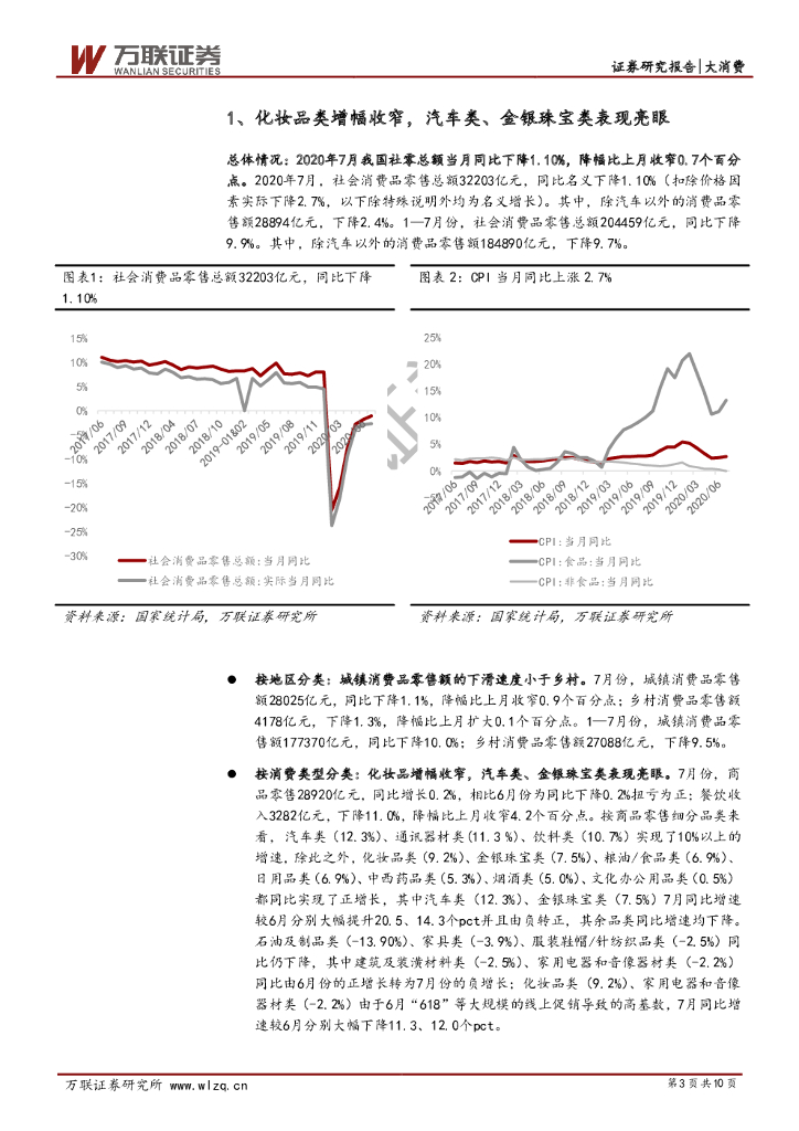 万联证券:2020年7月社会消费品零售数据点评:化妆品类增幅收窄,汽车类、金银珠宝类表现亮眼.pdf
