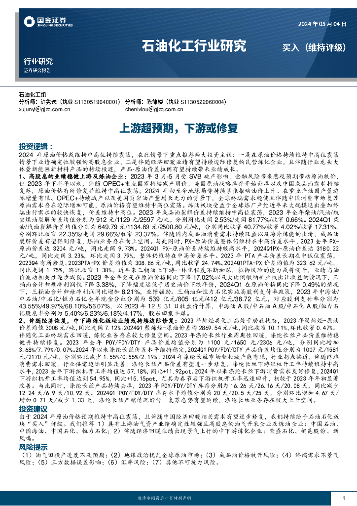 国金证券:石油化工行业研究:上游超预期,下游或修复.pdf