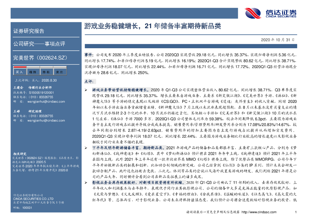 信达证券:完美世界(002624)-游戏业务稳健增长,21年储备丰富期待新品类.pdf