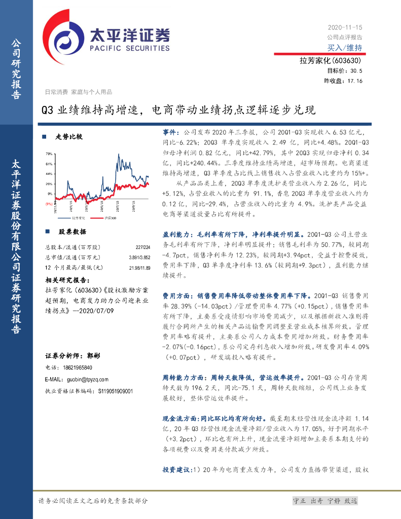 太平洋证券:拉芳家化(603630)-Q3业绩维持高增速,电商带动业绩拐点逻辑逐步兑现.pdf
