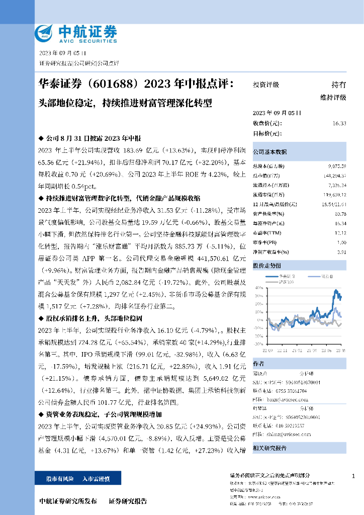 中航证券:华泰证券(601688)-2023年半年报点评:头部地位稳定,持续推进财富管理深化转型.pdf
