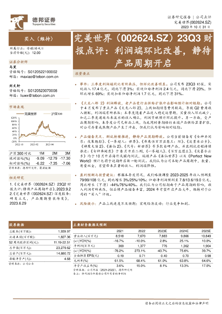 德邦证券:完美世界(002624)-23Q3财报点评:利润端环比改善,静待产品周期开启.pdf