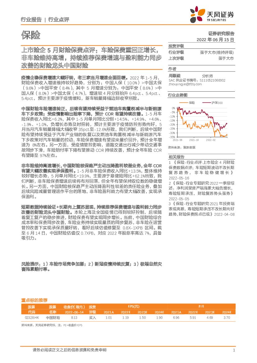天风证券:上市险企5月财险保费点评:车险保费重回正增长,非车险维持高增,持续推荐保费增速与盈利能力同步改善的财险龙头中国财险.pdf