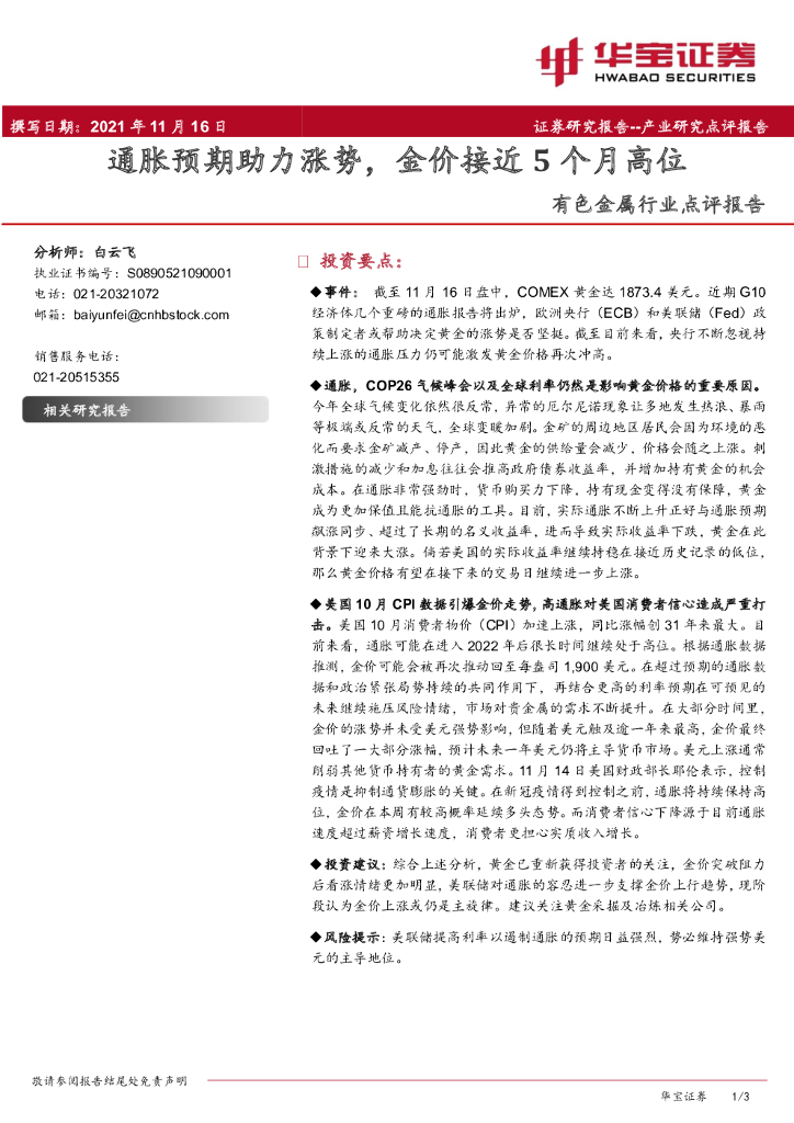 华宝证券:有色金属行业点评报告:通胀预期助力涨势,金价接近5个月高位.pdf