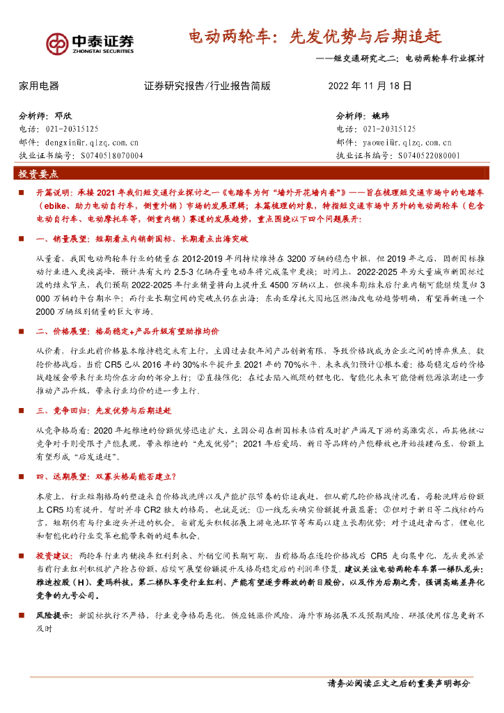 中泰证券:短交通研究之二:电动两轮车行业探讨-电动两轮车:先发优势与后期追赶.pdf