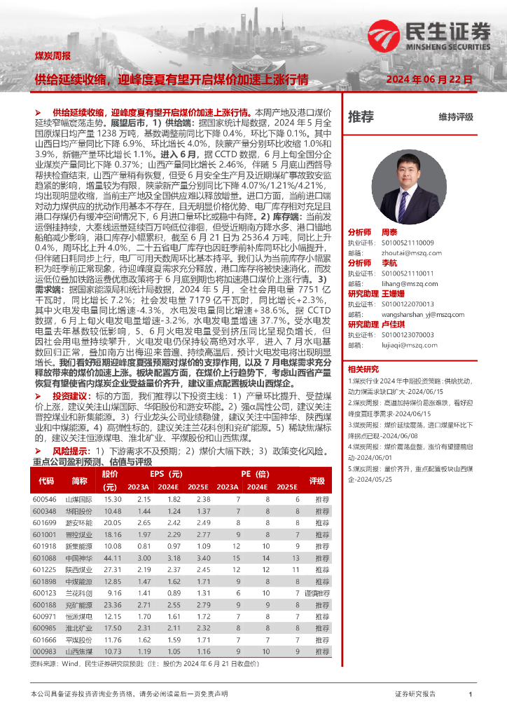 民生证券:煤炭周报:供给延续收缩,迎峰度夏有望开启煤价加速上涨行情.pdf