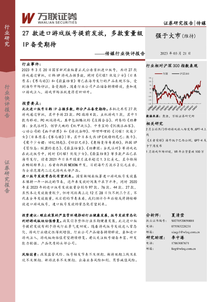 万联证券:传媒行业快评报告:27款进口游戏版号提前发放,多款重量级IP备受期待.pdf