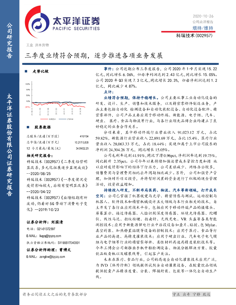 太平洋证券:科瑞技术(002957)-三季度业绩符合预期,逐步推进各项业务发展.pdf