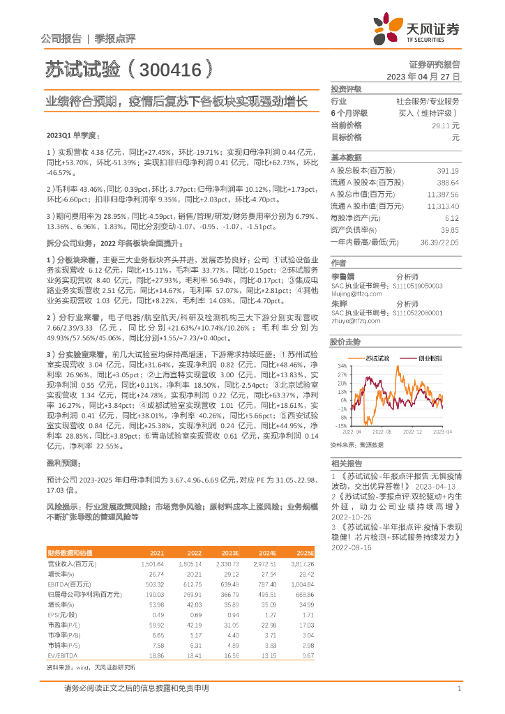 天风证券:苏试试验(300416)-业绩符合预期,疫情后复苏下各板块实现强劲增长.pdf
