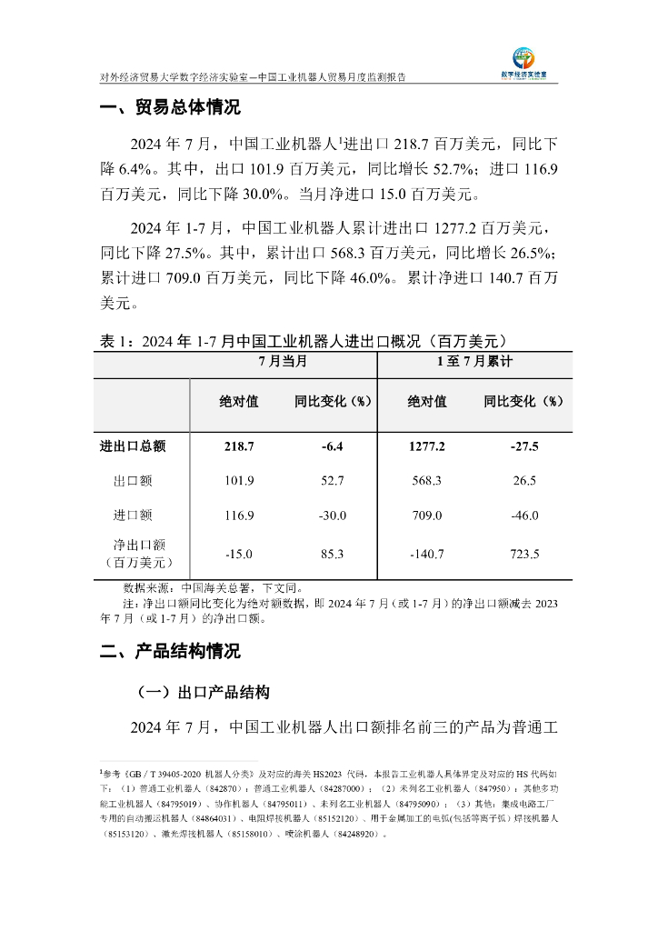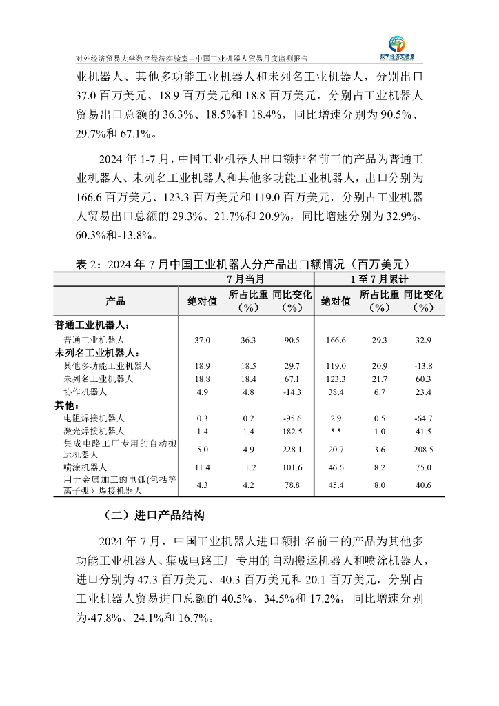 对外经济贸易大学:中国工业机器人贸易月度监测报告(2024年1-7月).pdf