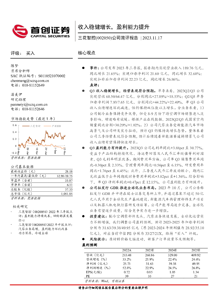 首创证券:三花智控(002050)-公司简评报告:收入稳健增长,盈利能力提升.pdf