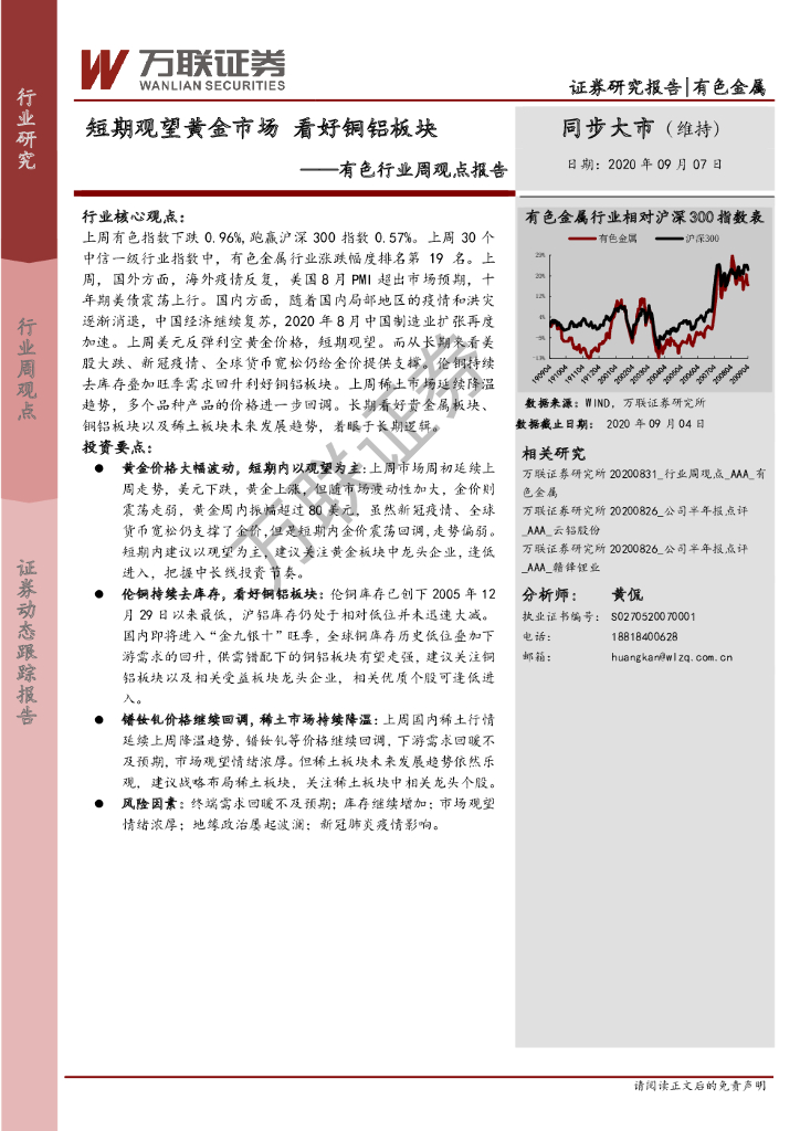 万联证券:有色行业周观点报告:短期观望黄金市场 看好铜铝板块.pdf