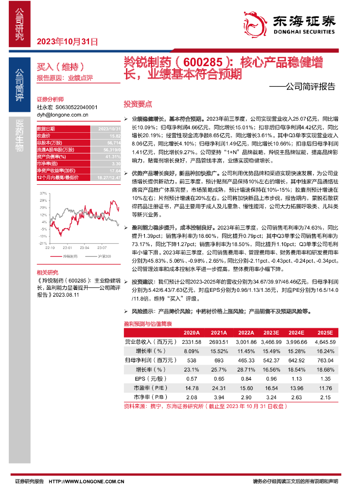 东海证券:羚锐制药(600285)-公司简评报告:核心产品稳健增长,业绩基本符合预期.pdf
