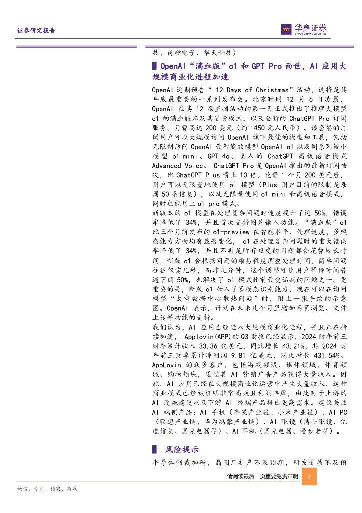 华鑫证券:电子行业周报:中国四大协会呼吁企业谨慎采购美国芯片,OpenAI“满血版”o1和GPTPro面世.pdf