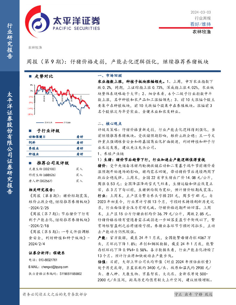 太平洋证券:农林牧渔周报(第9期):仔猪价格走弱,产能去化逻辑强化,继续推荐养猪板块.pdf