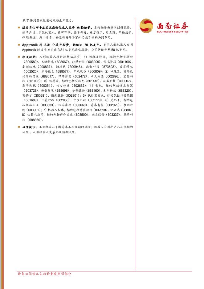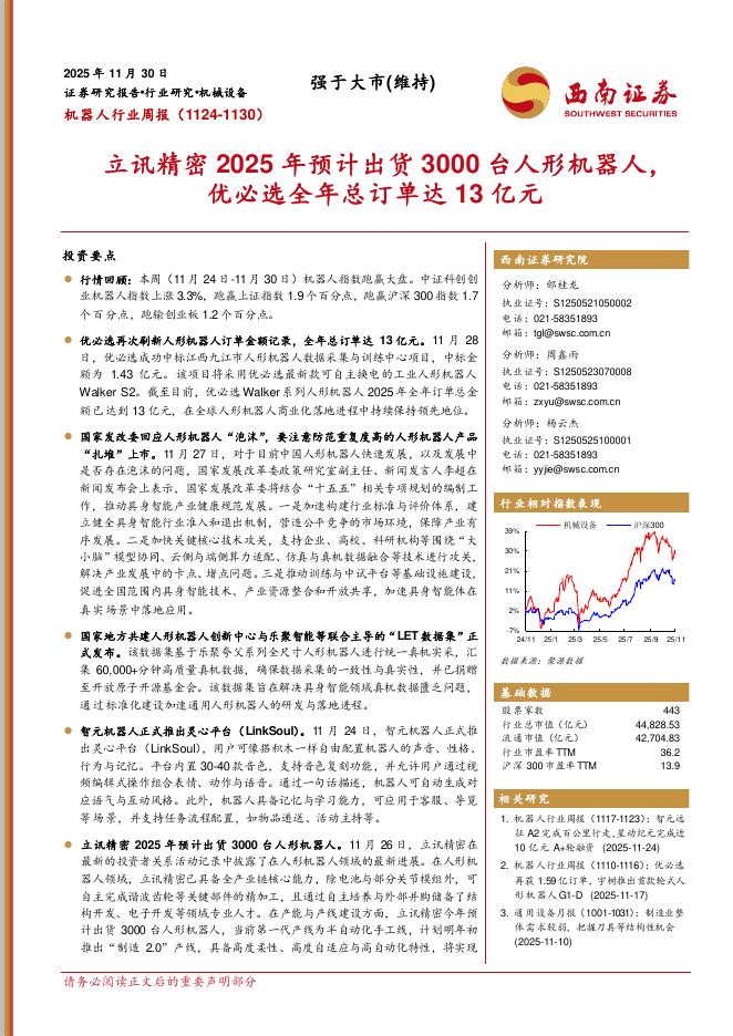西南证券:机器人行业周报:立讯精密2025年预计出货3000台人形机器人,优必选全年总订单达13亿元.pdf