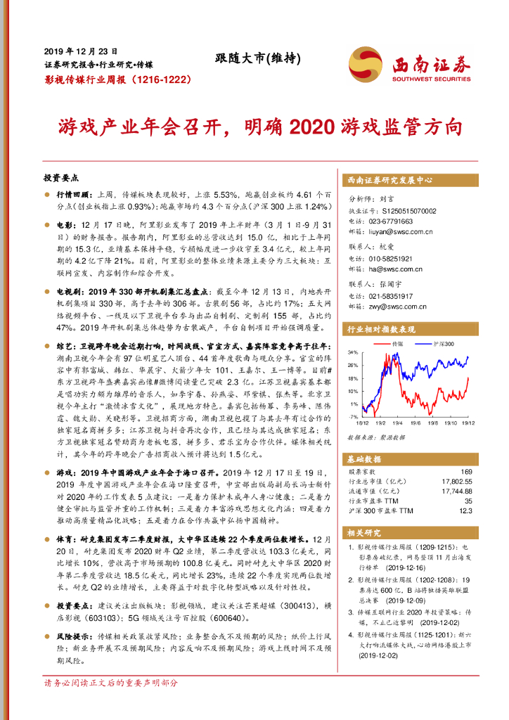 西南证券:影视传媒行业周报:游戏产业年会召开,明确2020游戏监管方向.pdf