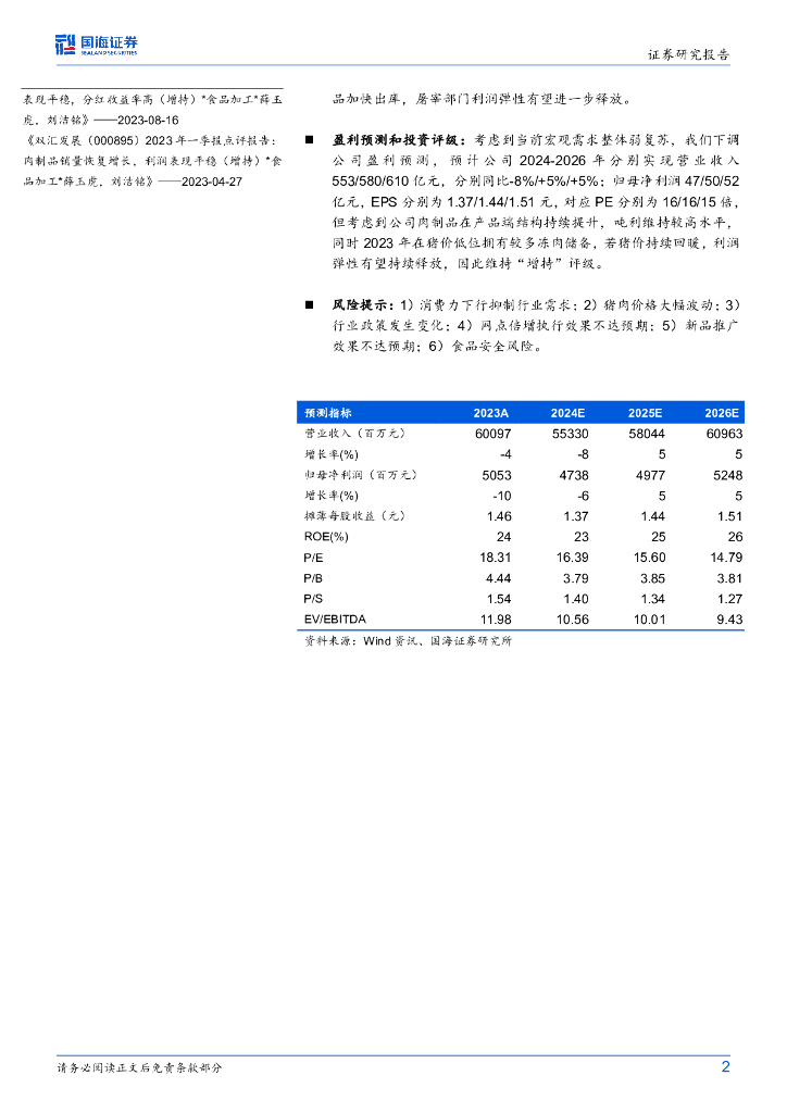 国海证券:双汇发展(000895)-2024年中报点评:肉制品销量承压,屠宰环比改善.pdf