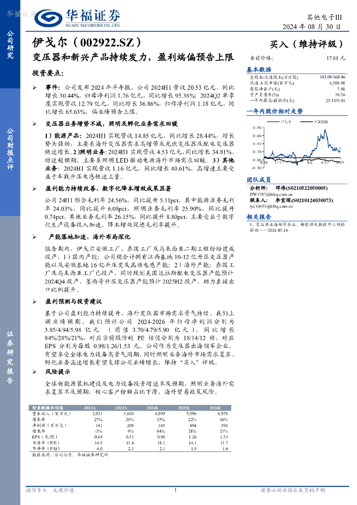 华福证券:伊戈尔(002922)-变压器和新兴产品持续发力,盈利端偏预告上限.pdf