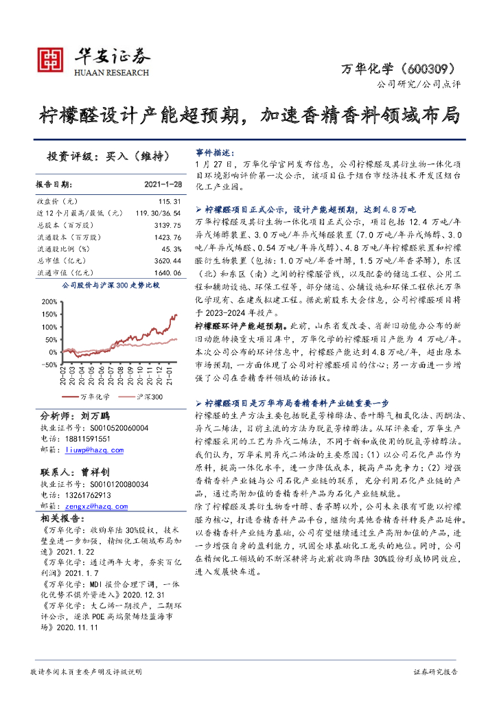 华安证券:万华化学(600309)-柠檬醛设计产能超预期,加速香精香料领域布局.pdf