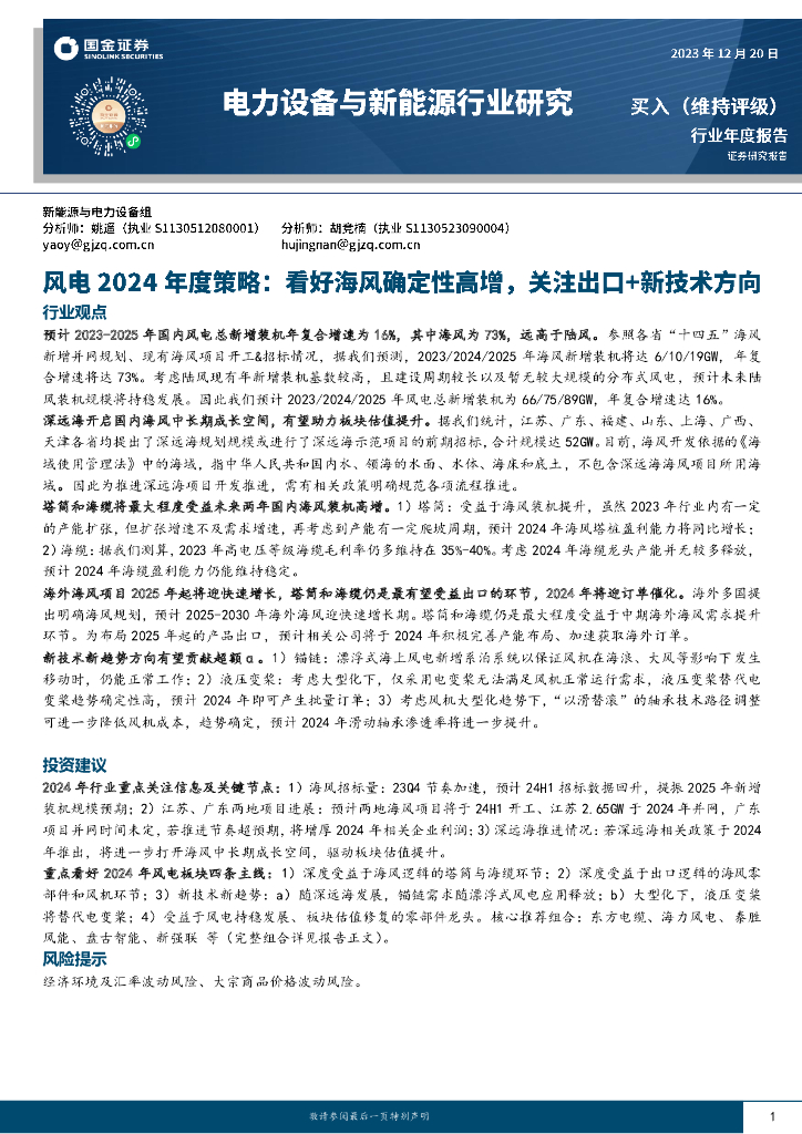 国金证券:风电2024年度策略:看好海风确定性高增,关注出口+新技术方向.pdf