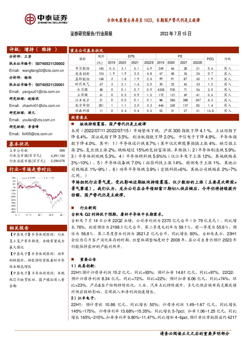 中泰证券:电子行业周报:台积电展望去库存至1H23,长期国产替代仍是主旋律.pdf