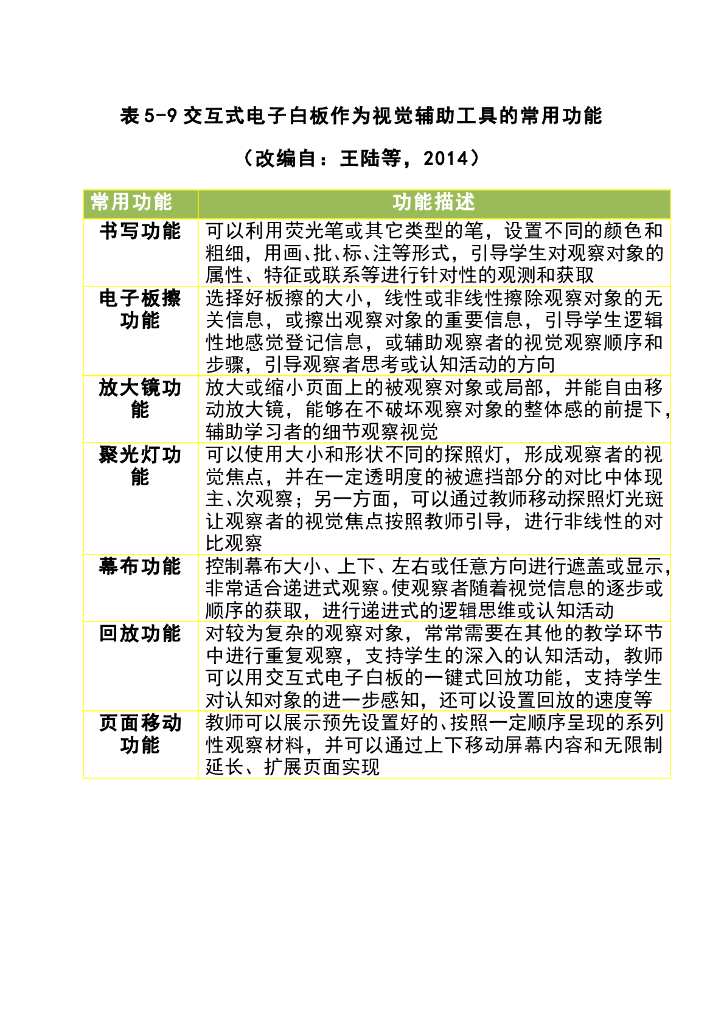《现代教育技术应用》教学课件-表5-9交互式电子白板作为视觉辅助工具的常用功能(改编自:王陆等,2014).pdf