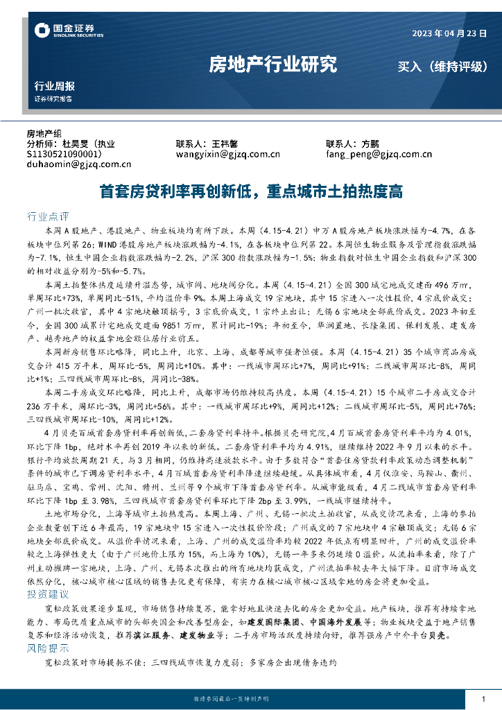 国金证券:房地产行业周报:首套房贷利率再创新低,重点城市土拍热度高.pdf