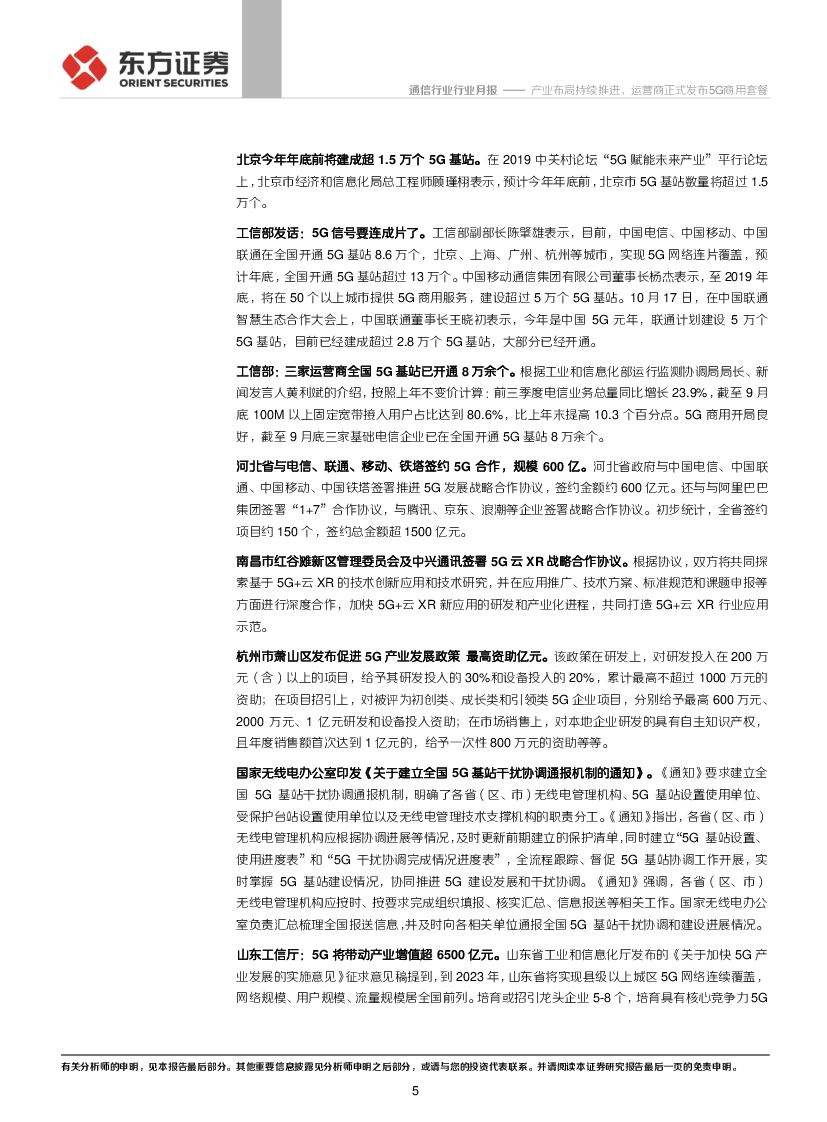 东方证券:通信行业月报:产业布局持续推进,运营商正式发布5G商用套餐.pdf