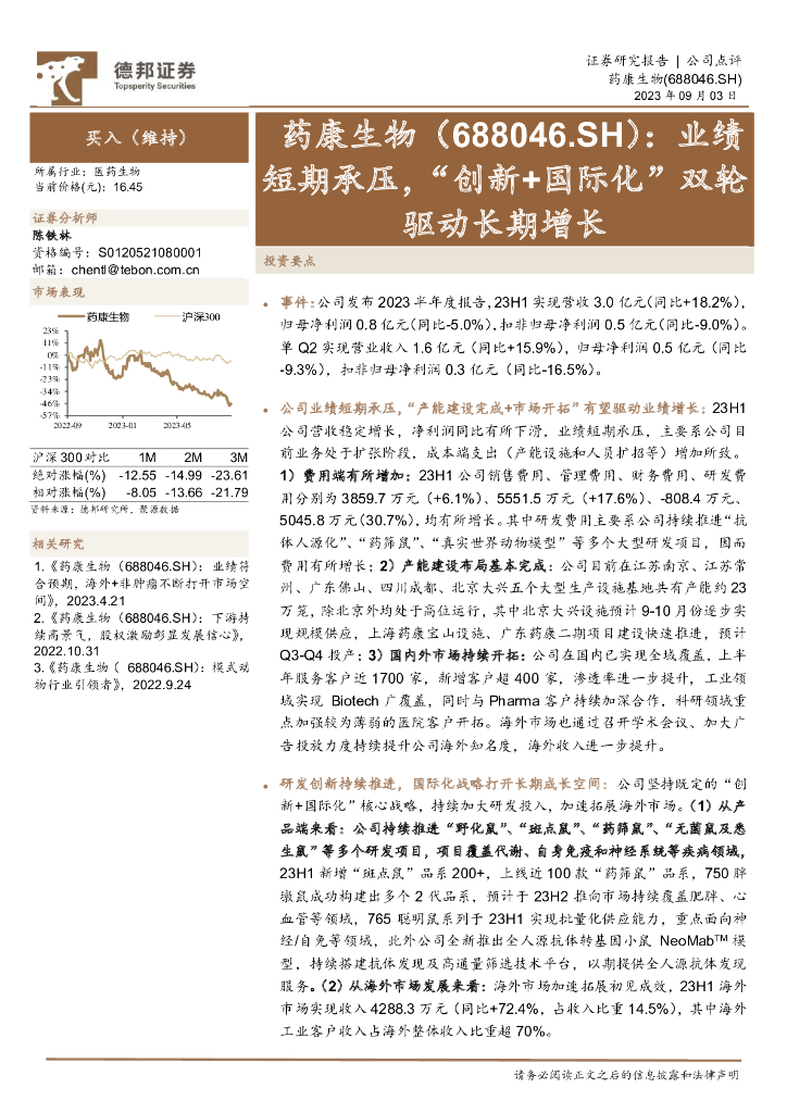 德邦证券:药康生物(688046)-业绩短期承压,“创新+国际化”双轮驱动长期增长.pdf