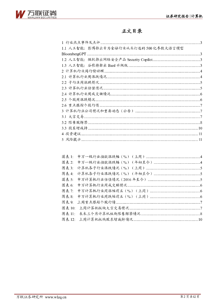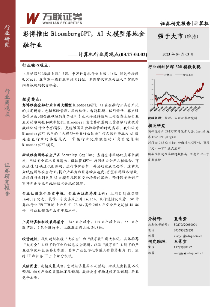 万联证券:计算机行业周观点:彭博推出BloombergGPT,AI大模型落地金融行业.pdf