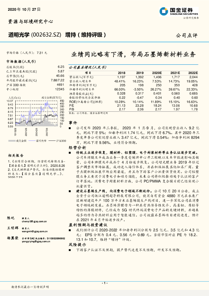 国金证券:道明光学(002632)-业绩同比略有下滑,布局石墨烯新材料业务.pdf
