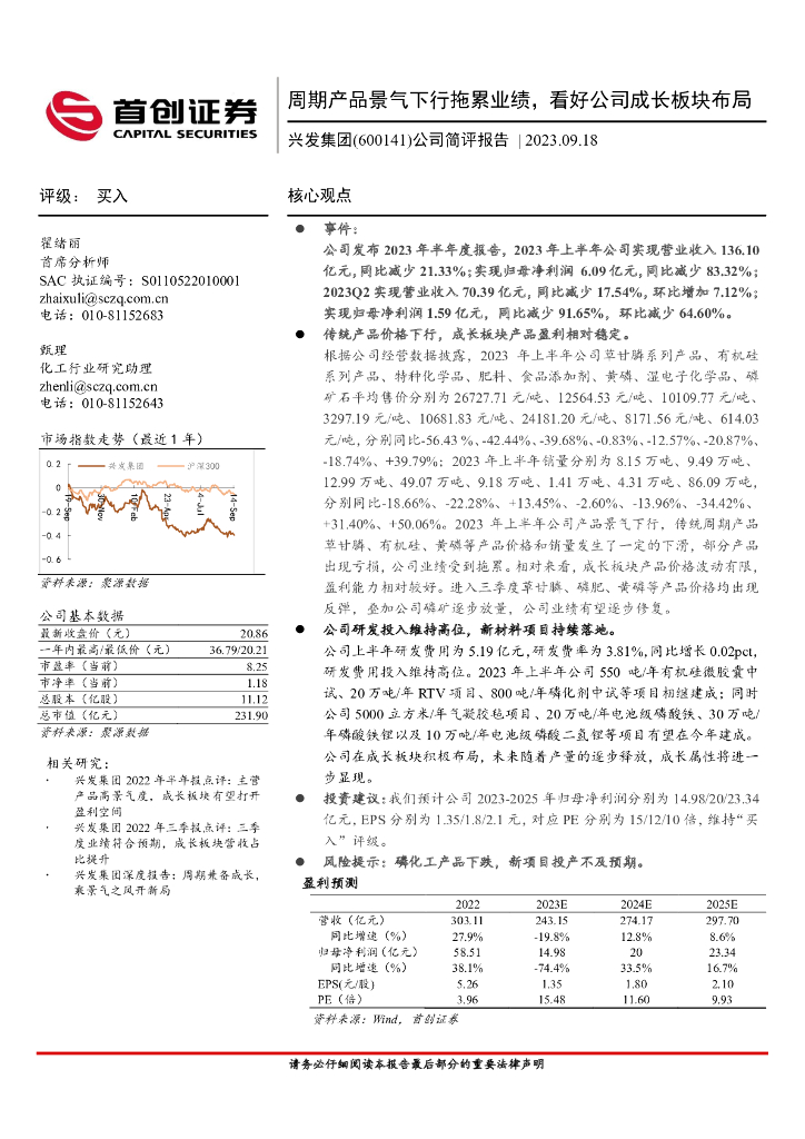 首创证券:兴发集团(600141)-公司简评报告:周期产品景气下行拖累业绩,看好公司成长板块布局.pdf