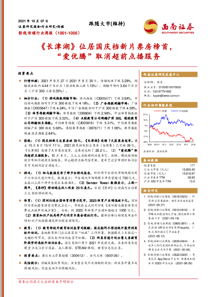 西南证券:影视传媒行业周报:《长津湖》位居国庆档新片票房榜首,“爱优腾”取消超前点播服务.pdf