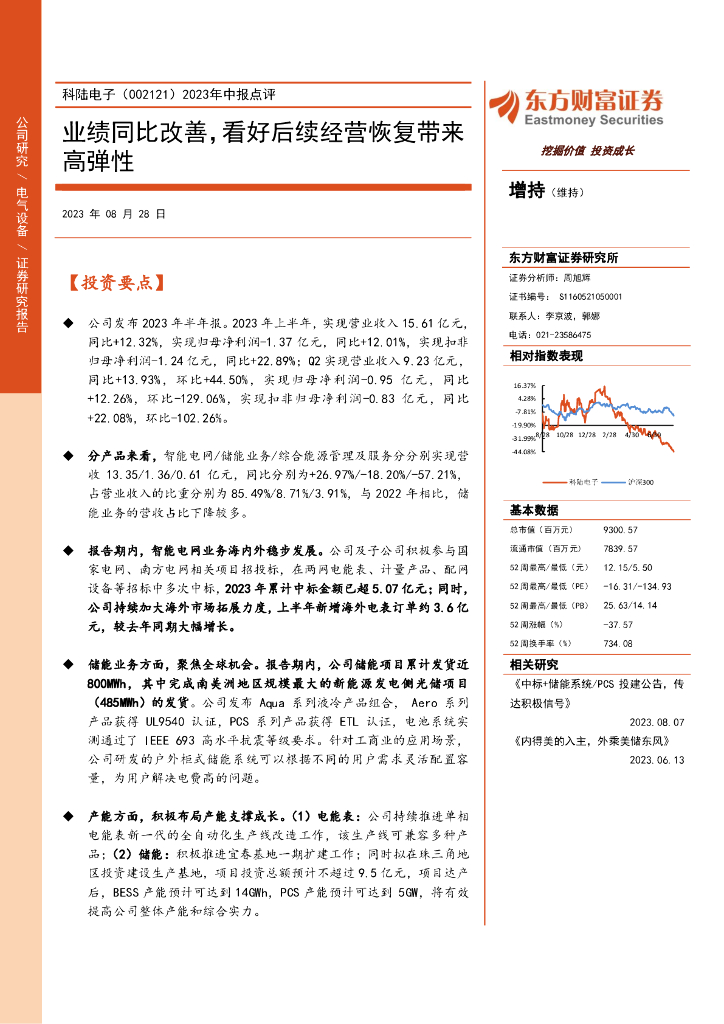 东方财富证券:科陆电子(002121)-2023年中报点评:业绩同比改善,看好后续经营恢复带来高弹性.pdf