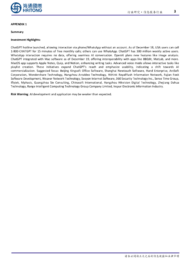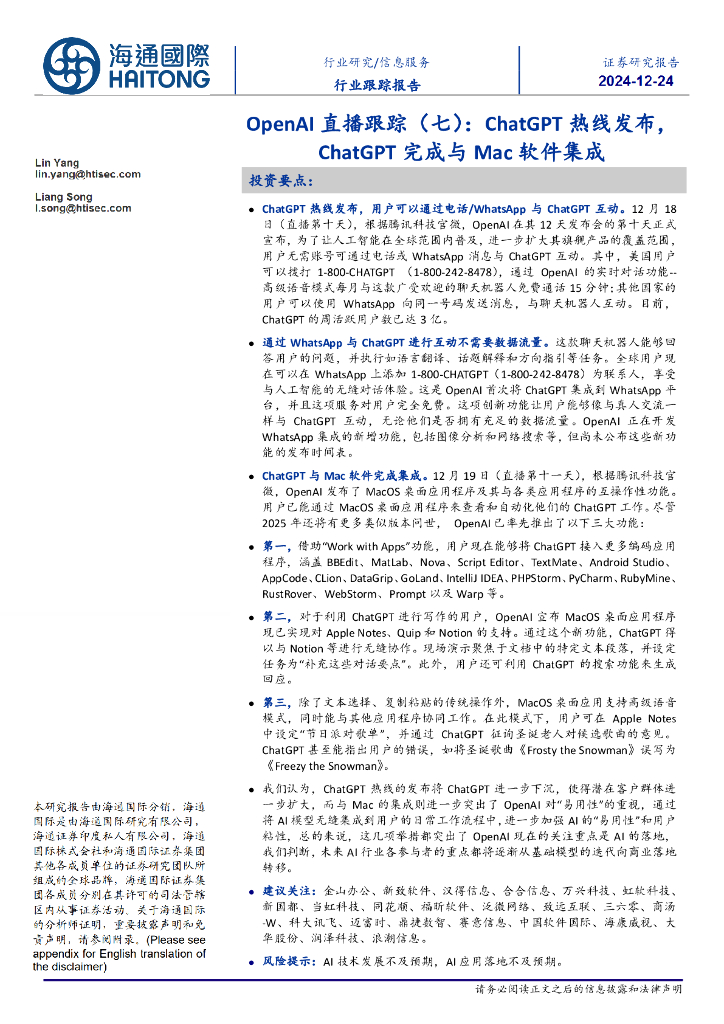 海通国际:信息服务行业跟踪报告:OpenAI直播跟踪(七):ChatGPT热线发布,ChatGPT完成与Mac软件集成.pdf