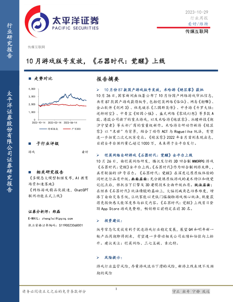 太平洋证券:传媒互联网行业周报:10月游戏版号发放,《石器时代:觉醒》上线.pdf
