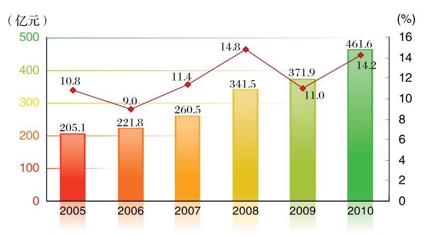 图6“十一五”时期社会消费品零售总额及增幅