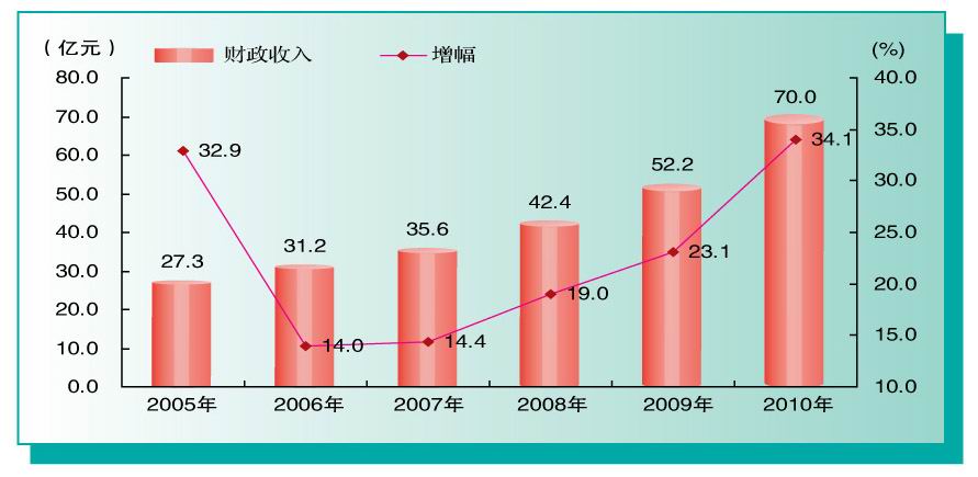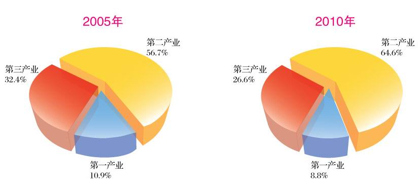国民经济快速发展。初步核算,全年实现地区生产总值(GDP)461.6亿元,按可比价格计算,比上年增长14.2%。其中,第一产业增加值40.4亿元,增长4.8%;第二产业增加值298.4亿元,增长18.2%;第三产业增加值122.8亿元,增长9%。按常住人口计算,人均生产总值22300元(折合3266美元),比上年增加4204元。“十一五”期间,全市生产总值年均增长12.1%,增幅高于“十五”时期1.6个百分点,其中第一产业年均增长6.1%,第二产业年均增长14.5%,第三产业年均增长9.3%;三次产业结构由2005年的10.9:56.7:32.4变化为2010年的8.8:64.6:26.6。