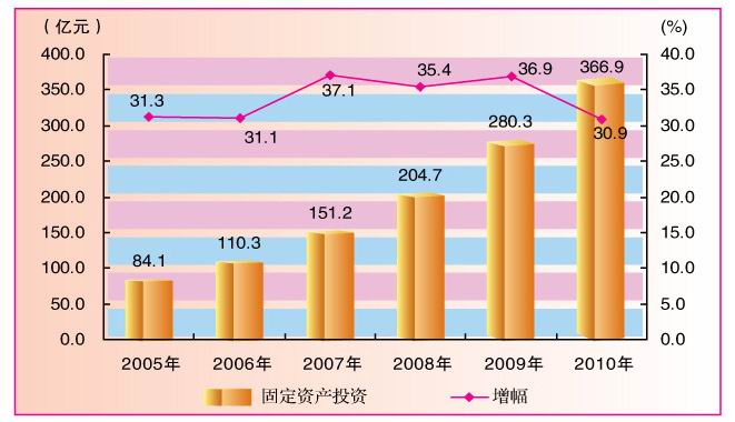 投资规模继续扩大。全年在建施工项目880个,其中新开工项目667个,计划总投资891.9亿元,全年完成投资366.9亿元,增长30.9%。其中城镇项目投资311.5亿元,增长31.2%;房地产开发投资42.5亿元,增长35%;农村非农户投资12.9亿元,增长14.1%。分产业看,第一产业投资4.4亿元,下降17%;第二产业投资244.9亿元,增长37.2%;第三产业投资117.6亿元,增长21.8%。全年工业完成投资239.6亿元,增长35.3%,其中采矿业投资66.9亿元,增长2.6%;制造业投资165亿元,增长62.6%;电力行业投资7.7亿元,下降25.6%。“十一五”时期,全市累计完成固定资产投资1113.4亿元,是“十五”时期投资总量的4.1倍;年均增长34.3%,分别比“九五”和“十五”时期加快16和19.2个百分点,是改革开放以来投资增速最快的时期。