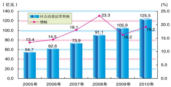 消费品市场繁荣活跃。全年实现社会消费品零售总额125.5亿元,比上年增长19.2%。分城乡看,城镇消费品零售额100.5亿元,增长19.2%;乡村消费品零售额25亿元,增长18.8%。分行业看,批发和零售业零售额分别为9.9亿元和99.1亿元,分别增长24.1%和18.1%;住宿和餐饮业零售额分别为0.9亿元和15.6亿元,分别增长29.1%和22.8%。“十一五”期间,全市累计实现社会消费品零售额459.1亿元,是“十五”时期的1.8倍;年均增长18.1%,比“十五”时期提高8.1个百分点。