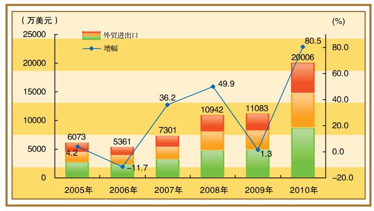 对外贸易快速增长。全年完成进出口总额20006万美元,比上年增长80.5%,其中出口14024万美元,增长46.4%,进口5982万美元,增长297.9%;专业外贸公司出口5191万美元,增长145%;自营生产企业出口5759万美元,增长59%;“三资”企业出口3074万美元,增长29.4%。“十一五”时期,全市累计完成外贸进出口总额5.5亿美元,其中出口4.5亿美元,年均分别增长26.9%和23.1%。