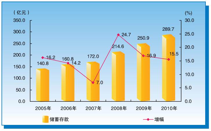 图10“十一五”时期居民储蓄存款及增幅