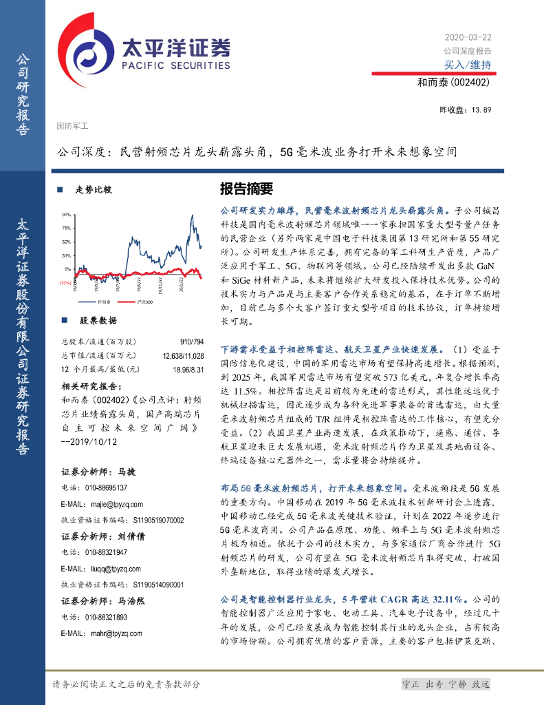 太平洋证券:和而泰(002402)-公司深度:民营射频芯片龙头崭露头角,5G毫米波业务打开未来想象空间.pdf