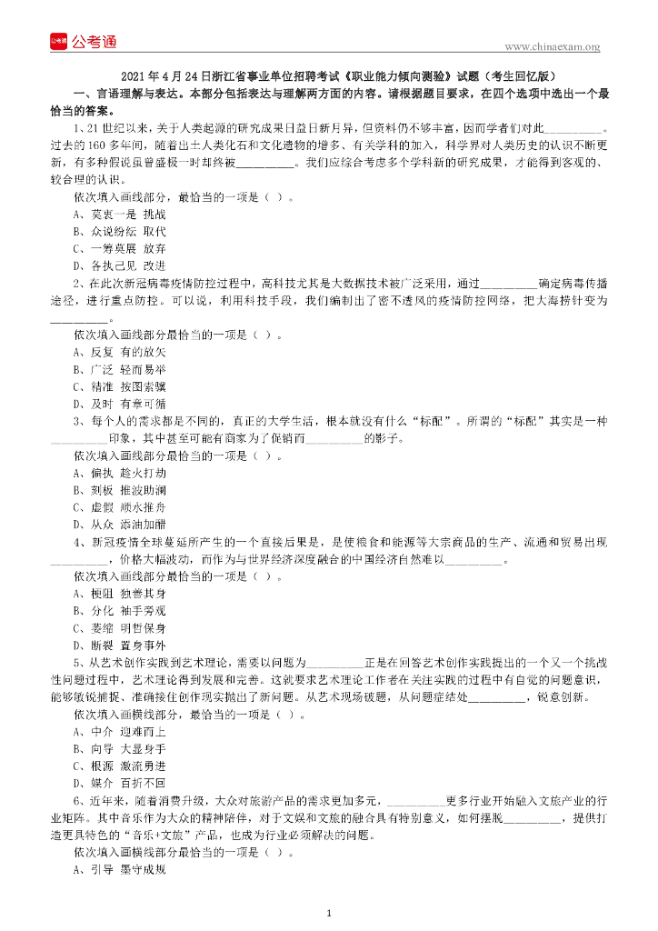 2021年4月24日浙江省事业单位招聘考试《职业能力倾向测验》试题.pdf