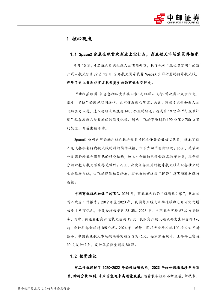 中邮证券:国防军工行业报告:SpaceX完成全球首次商业太空行走,商业航天市场前景再拓宽.pdf