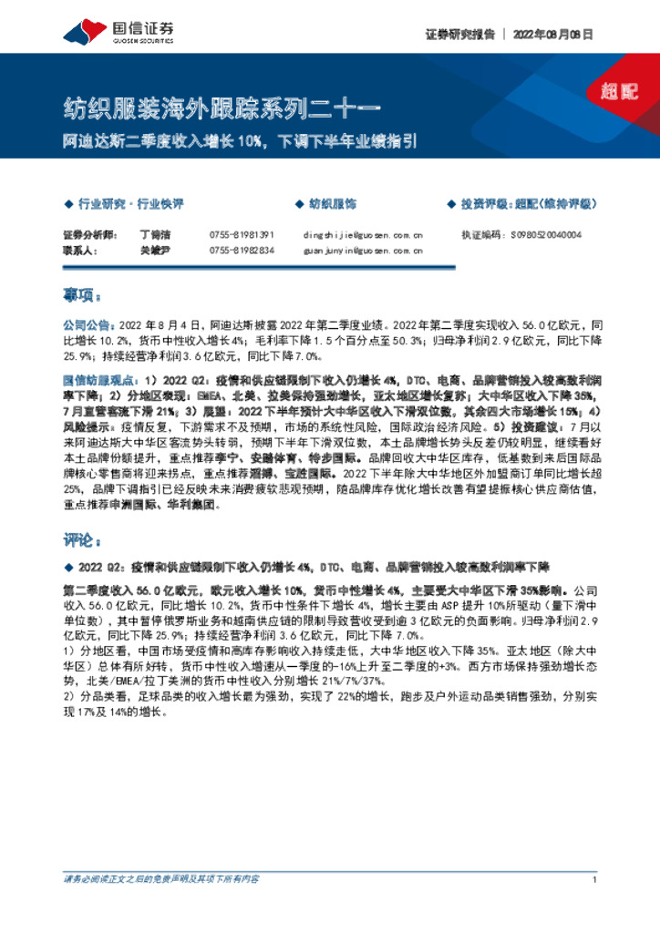 国信证券:纺织服装海外跟踪系列二十一:阿迪达斯二季度收入增长10%,下调下半年业绩指引.pdf