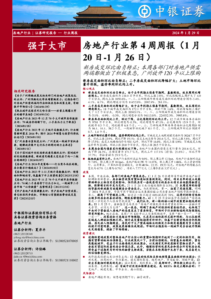 中银证券:房地产行业第 4 周周报(1月:20 日-1月 26 日)新房成交环比由负转正;本周各部门对房地产供需两端都做出了积极表态,广州放开120平以上限购.pdf