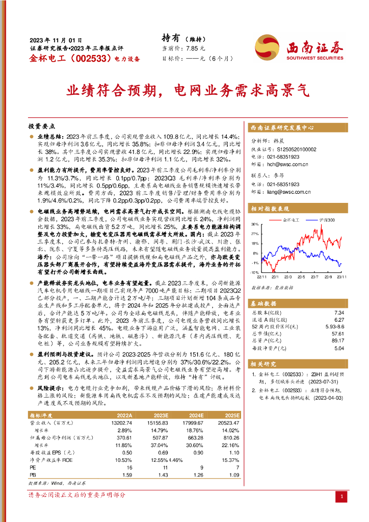 西南证券:金杯电工(002533)-2023年三季报点评:业绩符合预期,电网业务需求高景气.pdf