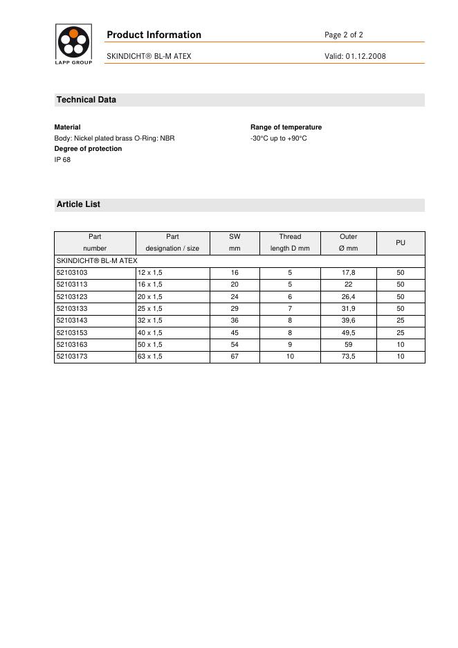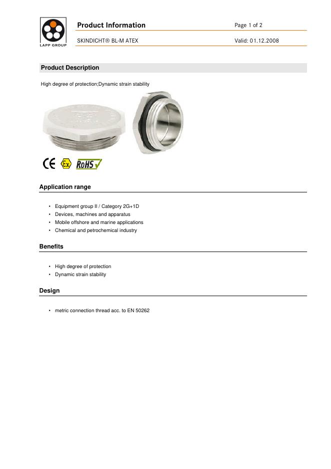 LAPP KABEL Product Information Page 1 of 2 SKINDICHT BL-M ATEX Valid: 01.12.2008 数据手册.pdf